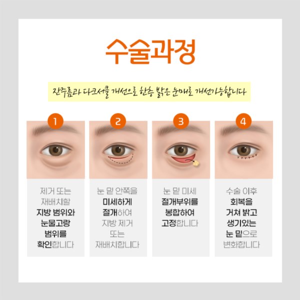눈 밑의 불룩하게 나온 지방을 제거하거나 꺼진 눈물 고랑 등으로 재배치하여 눈 밑을 편평하게 만듭니다. 늘어지고 처진 피부를 제거하고 약해진 눈 밑 근육을 당겨 고정하여 탄력을 개선하고 처짐을 바로잡습니다. 수술은 크게 두 가지 방법으로 나눌 수 있으며 눈 밑 상태에 따라 결정됩니다. 속눈썹 바로 아래 부분 라인을 따라 절개하여 접근하는 방법입니다. 늘어진 피부를 충분히 제거하고 지방을 조절하거나 재배치합니다.