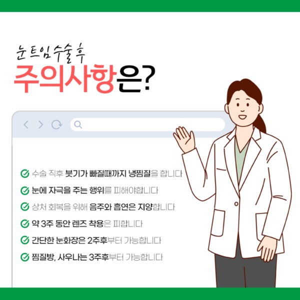 시술 부위가 완전히 아물기 전까지는 세수와 화장을 조심해야 합니다. 실밥을 뽑기 전까지는 시술 부위에 물이 닿지 않도록 주의하고 수술 후에는 술과 담배를 적어도 1개월 정도는 피하는 것이 회복에 중요합니다.