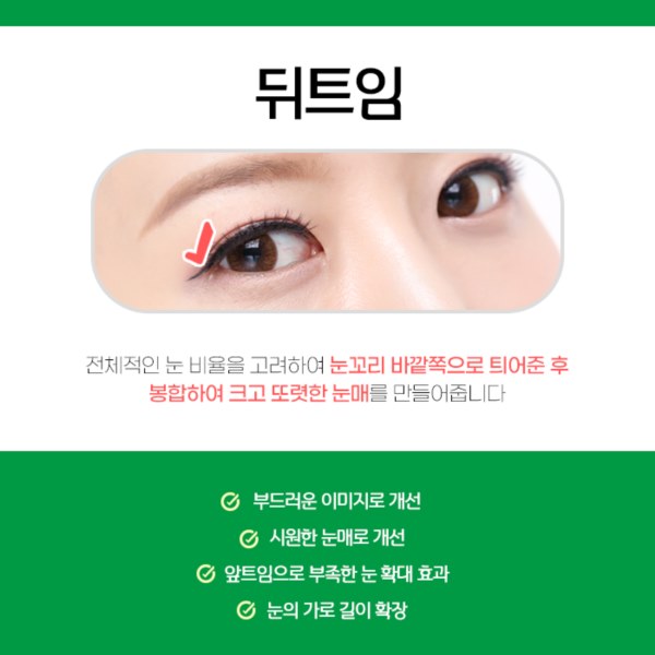 뒤트임은 눈의 바깥쪽 부분을 절개하여 확장하는 시술입니다. 이 시술을 통해 눈의 가로 길이가 늘어나면서 더욱 시원하고 트여 보이는 눈매를 연출할 수 있습니다. 단순히 눈꼬리를 절개하는 것을 넘어 눈꼬리 각도를 내리거나 올려 인상을 개선하는 효과도 기대할 수 있습니다.